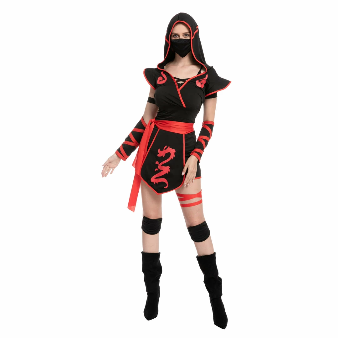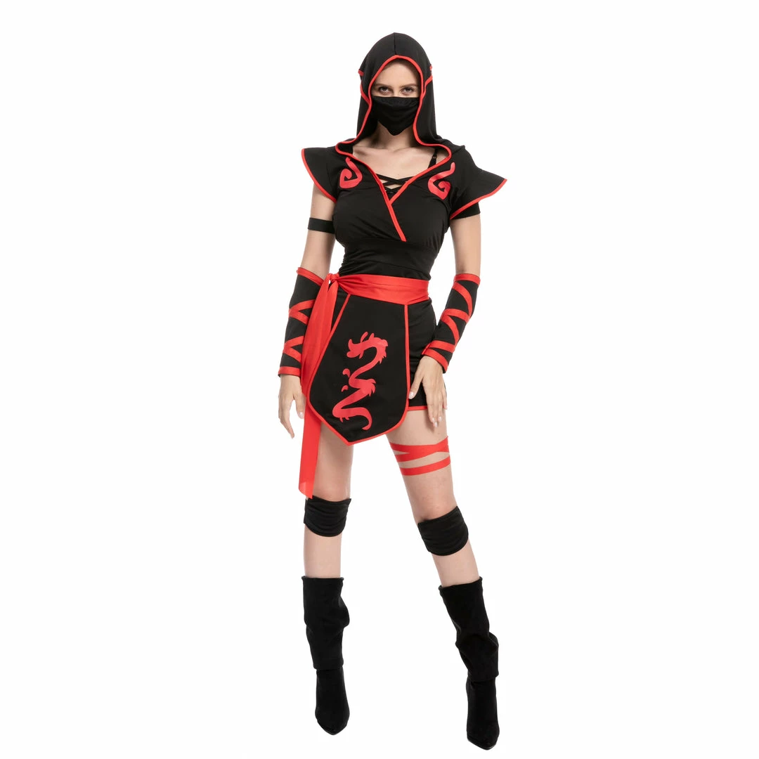- Includes a V neck and sleeveless styled with a dragon print designed costume, a Ninja Mask, Waist Sash, hood, arm warmers, knee pads, boots, and more.