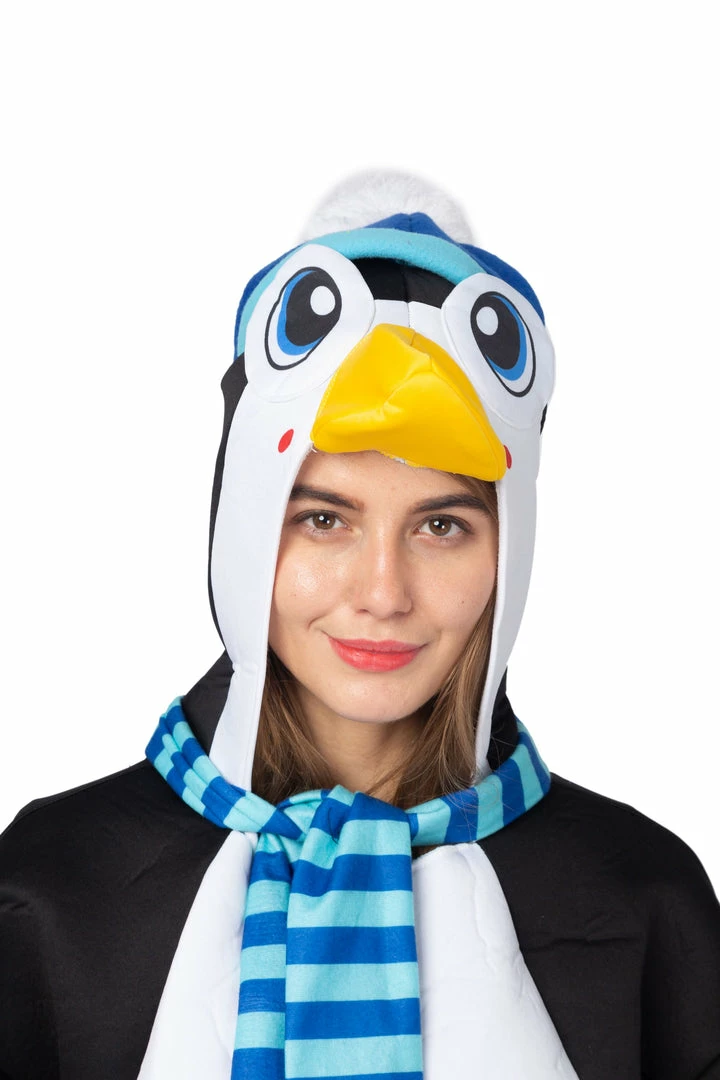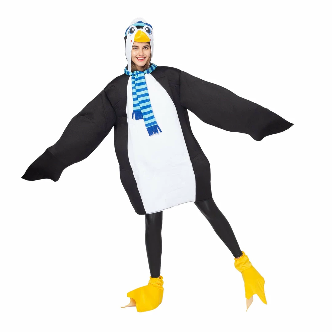 - Penguin Halloween Costume for Teens and Adults Includes Foam Tunic Penguin Suit with Attached Beanie, Scarf, and Boot Covers.