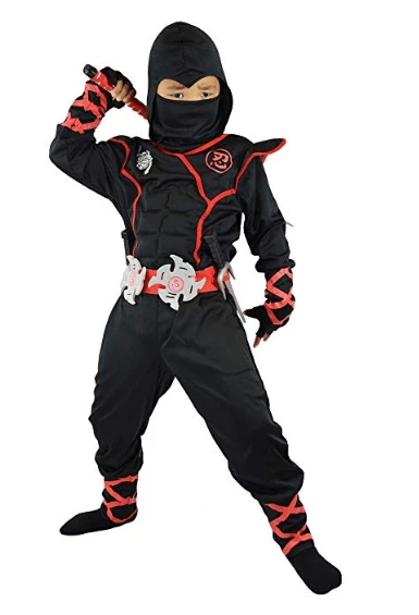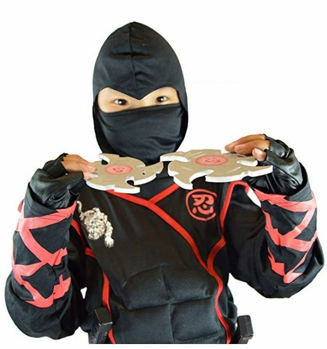 • Boys Ninja Costume with abs muscles for kids (total: 7 pcs) includes jumpsuit with attached hood, face mask, belt, gloves, 2 throwing stars and 2 ninja daggers!