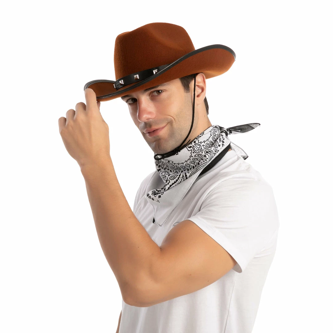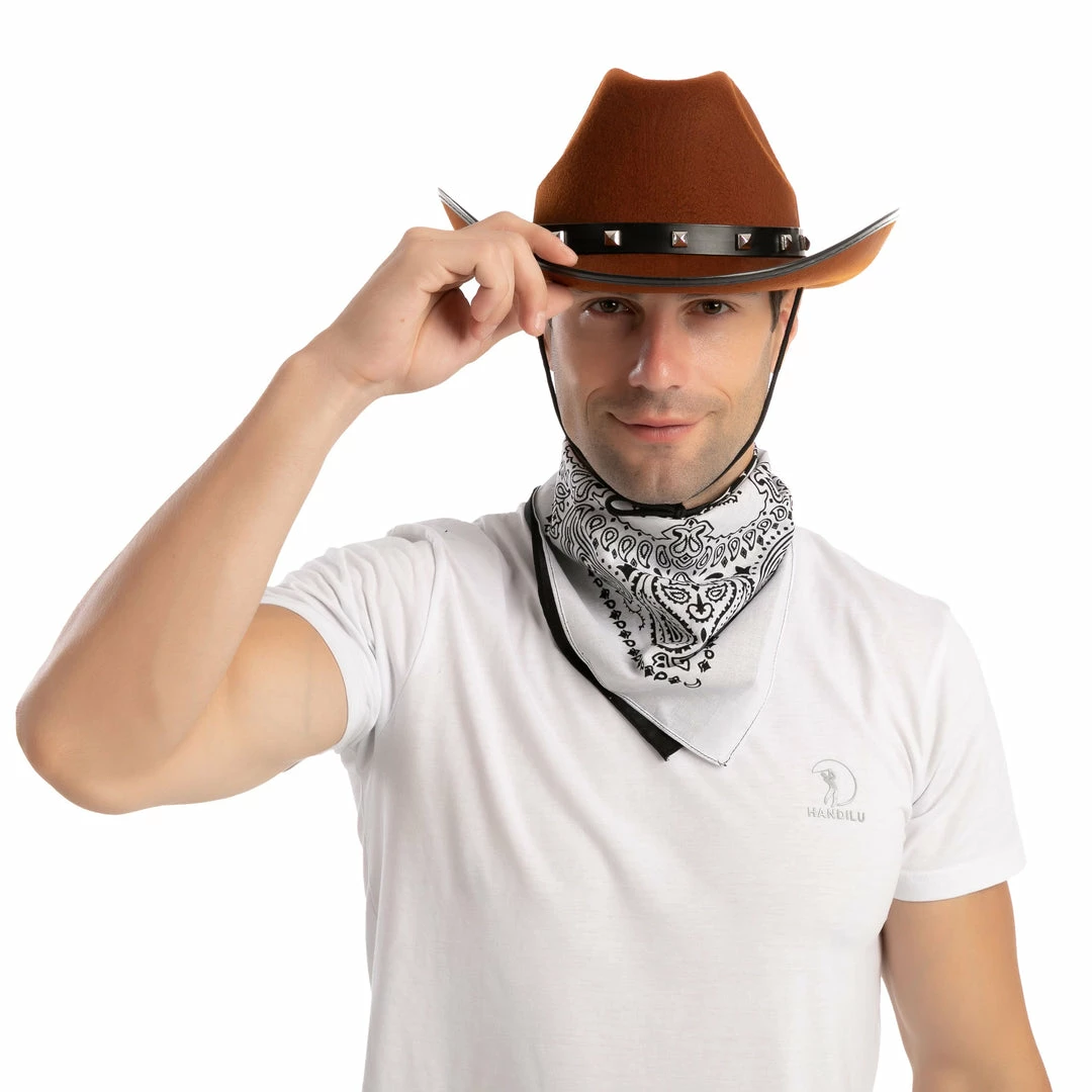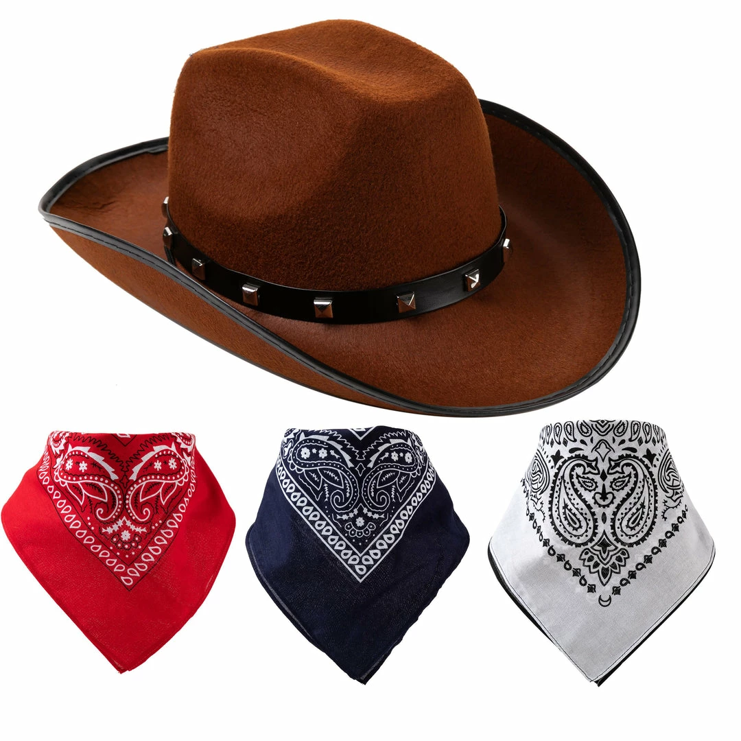 âą Cowboy costume includes a brown hat that comes with 3 colors of bandanas, red, white and half black with half white. Unique patterns. Premium quality.