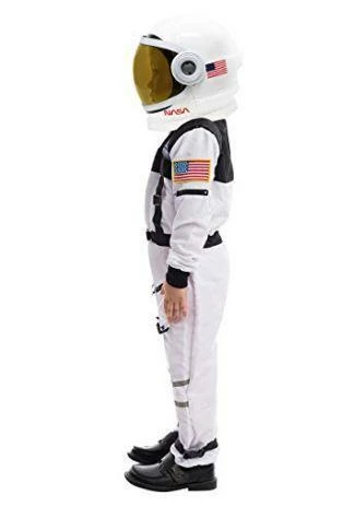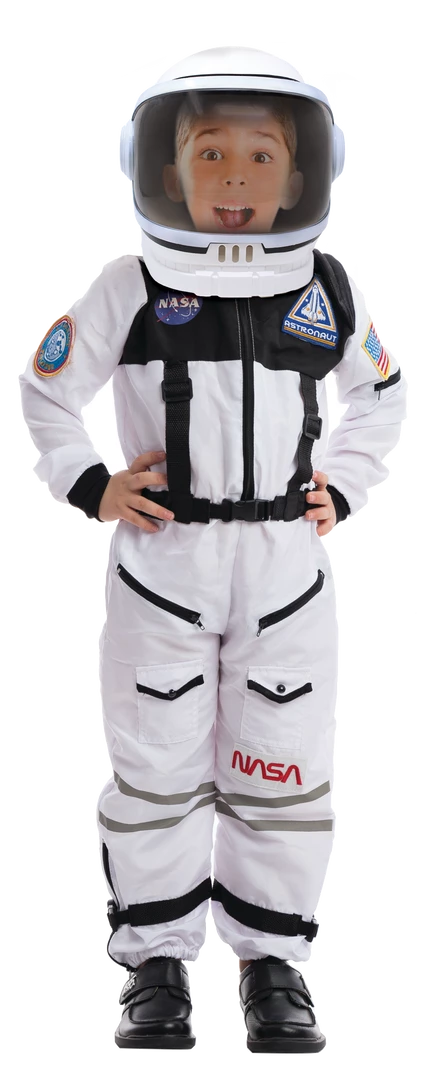 - Astronaut NASA Pilot Costume Includes a White Full-Length Body Jumpsuit with Embroidered NASA Logo and USA Flag Patches and a Tinted Movable Visor Space Helmet.