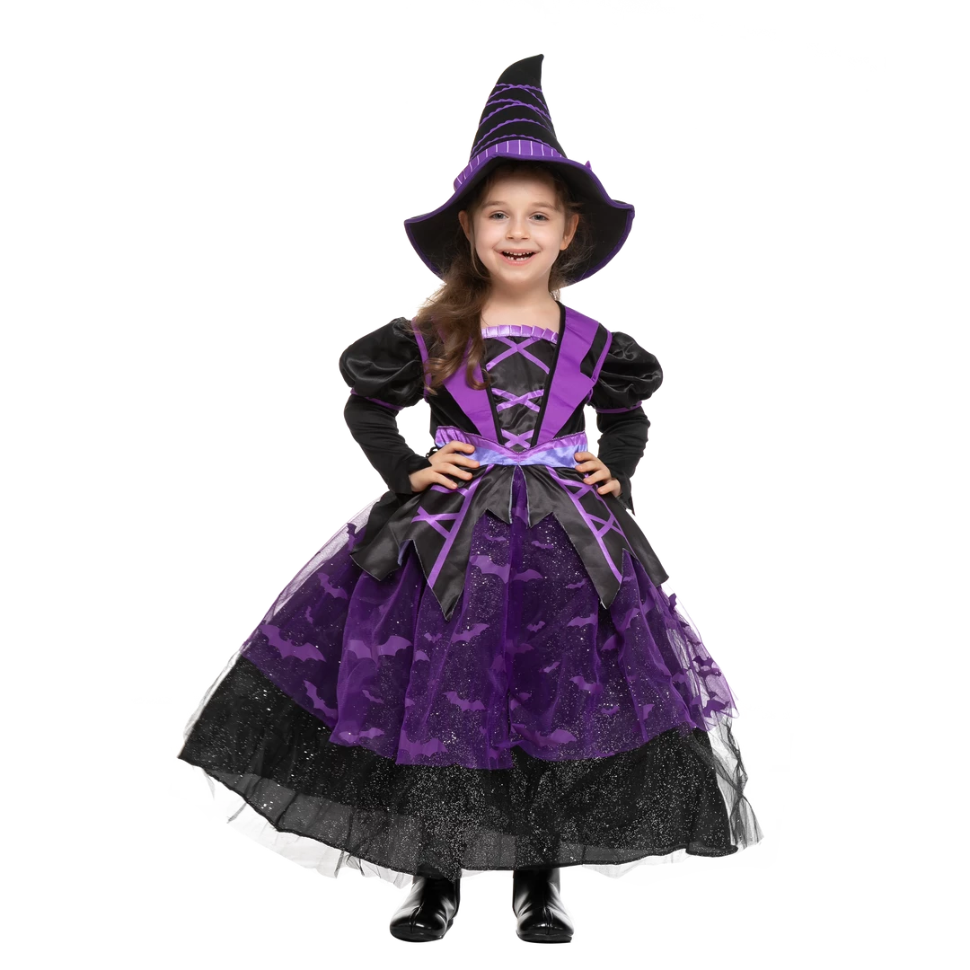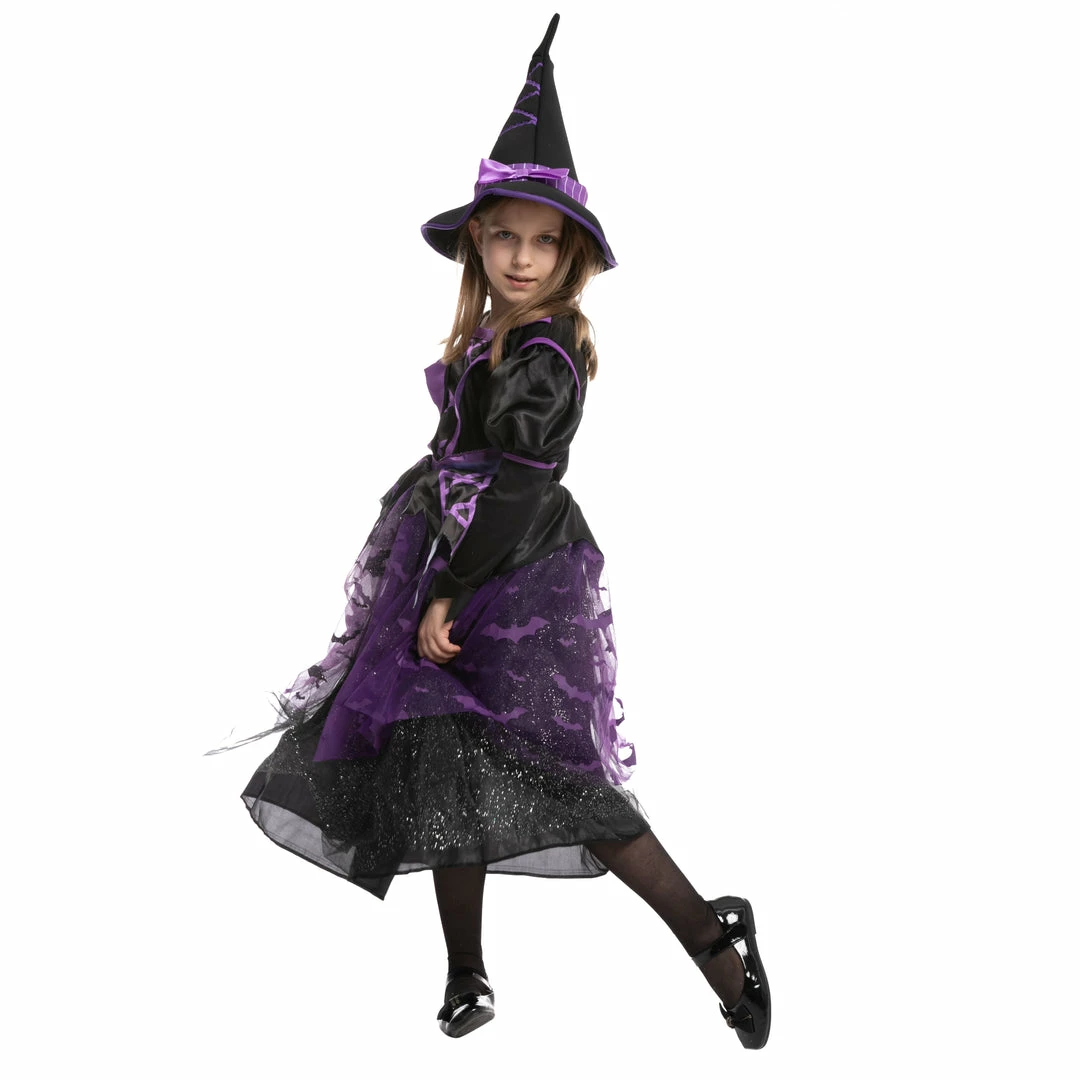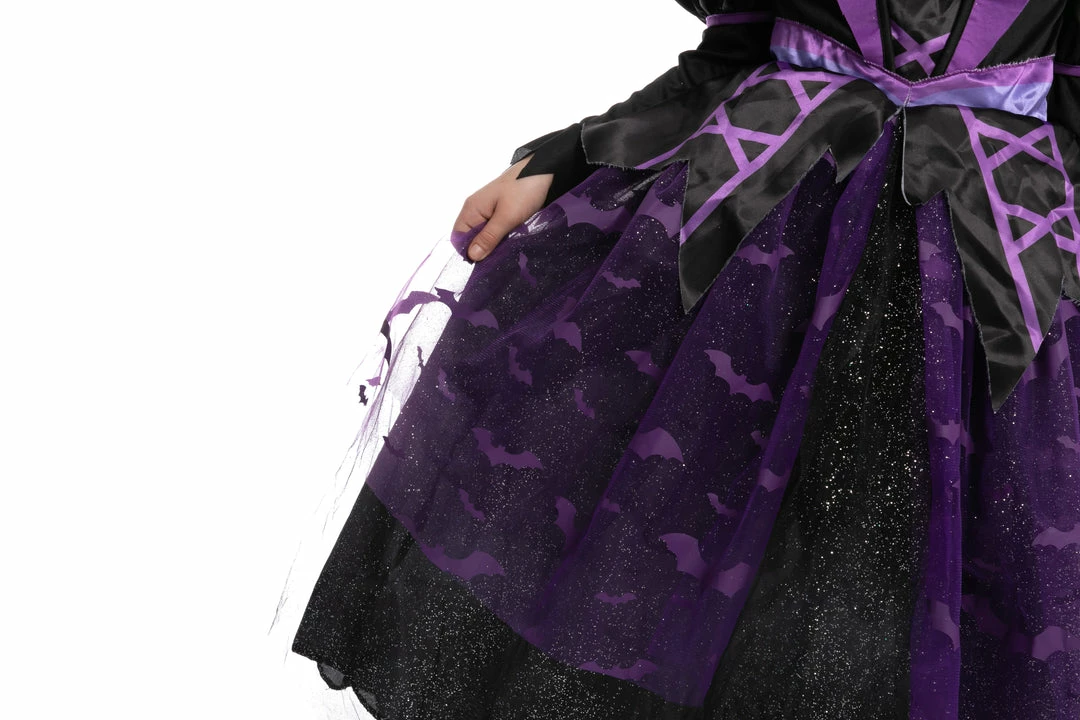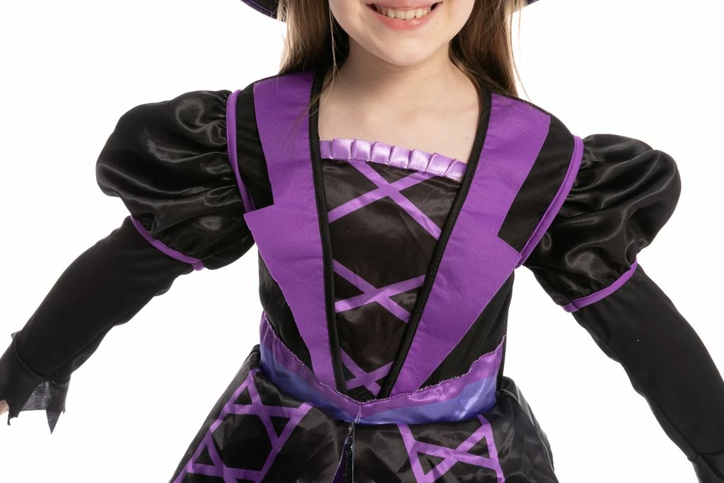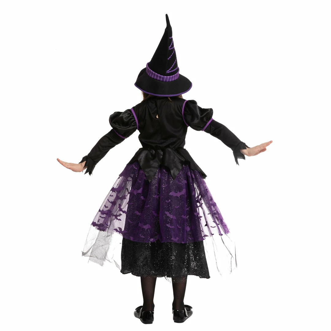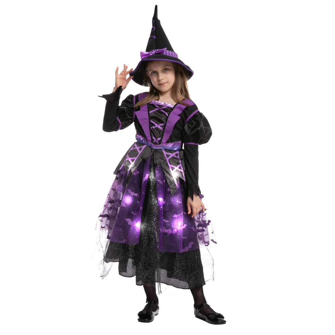 - Witch costume for girls includes 1 hat and 1 light up dress. The witch costume has a pullover hat feature and a dress with an elastic back waist and glittery knit mesh skirt overlay.