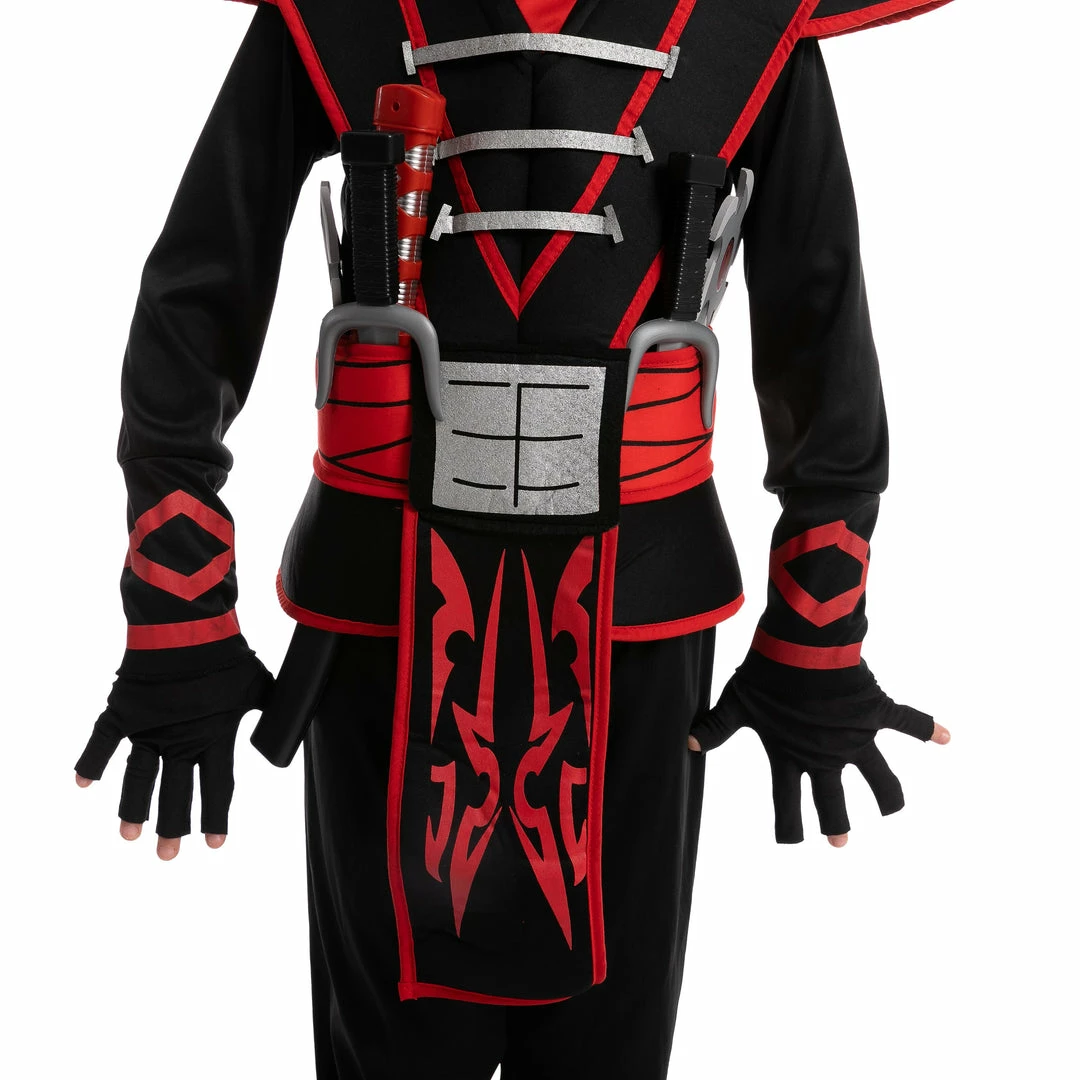 - Includes 1 ninja child costume jumpsuit w/ hood, 1 mask, 1 armor (chest and shoulders have foam armor) , 1 belt, 1 pair of gloves, 2 ninja daggers and other foam accessories.