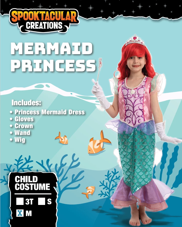 - Sea Goddess Costume includes Princess mermaid dress, Gloves, Crown, Wand and Wig