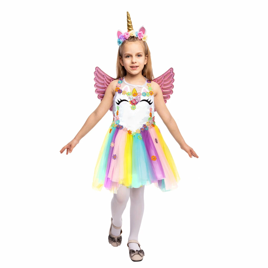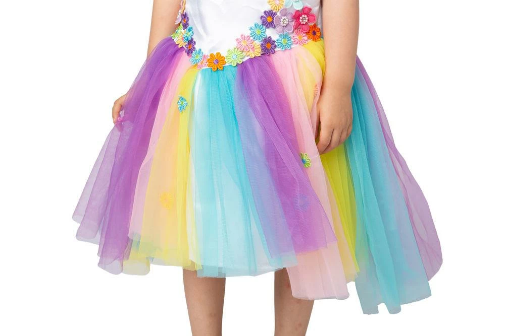 - Girls Unicorn Tulle Dress Costume includes Wings, Unicorn Horn Headband, and Floral Rainbow Unicorn Tutu with 3D flowers and Elegant Unicorn Shape Design on the Bodice.