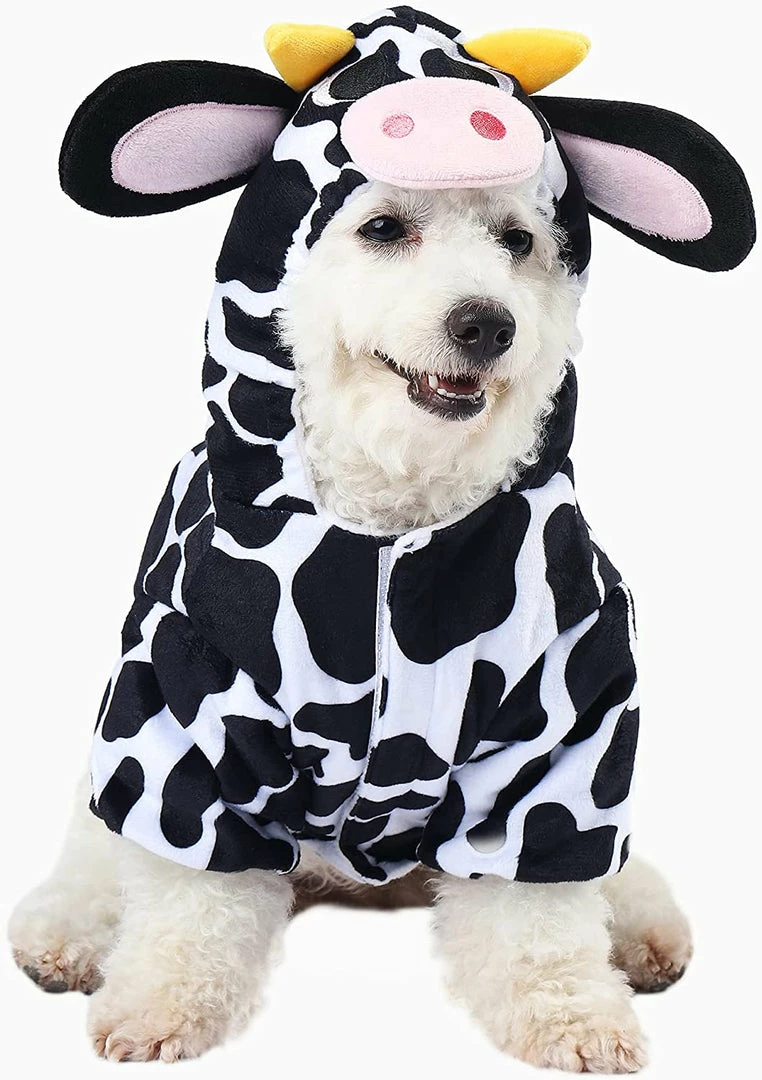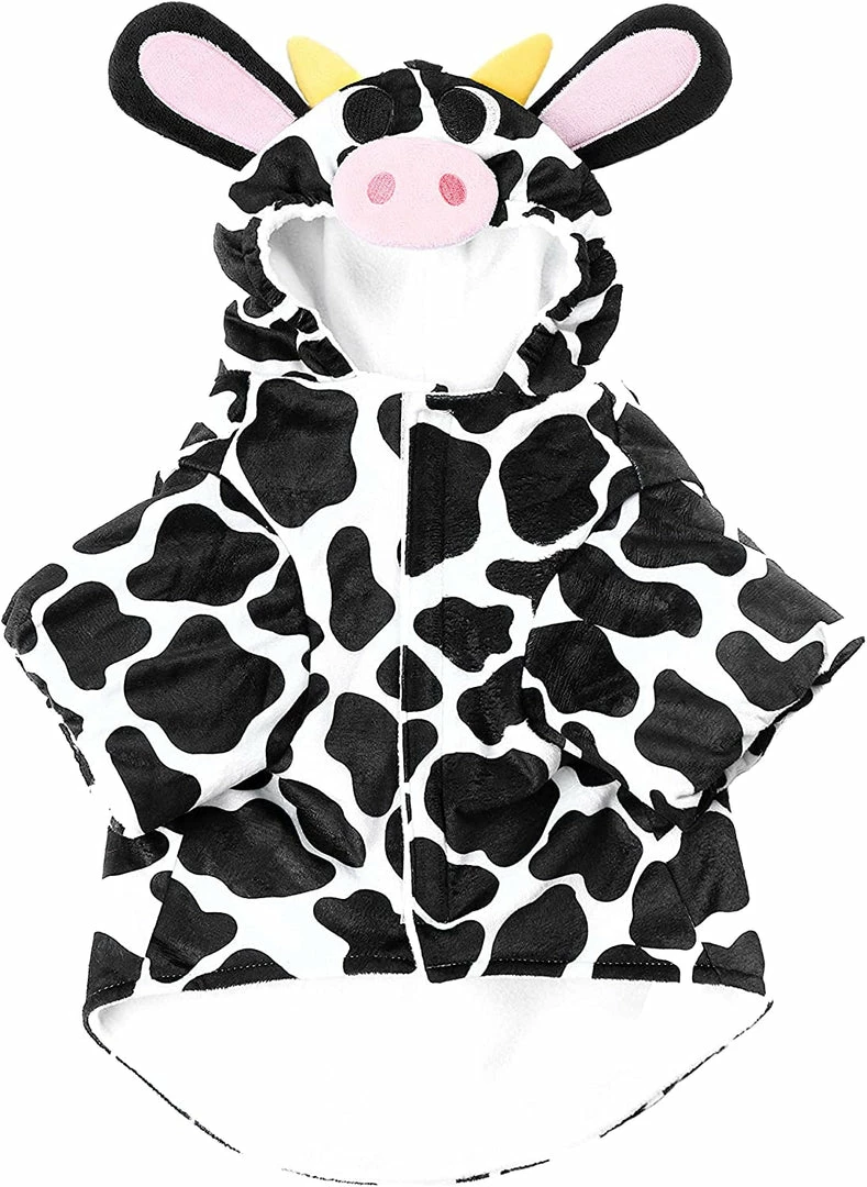 - Cow Hoodie Pet Costume includes 1 piece cow onesie with cute black and white spots and cow head design hood.