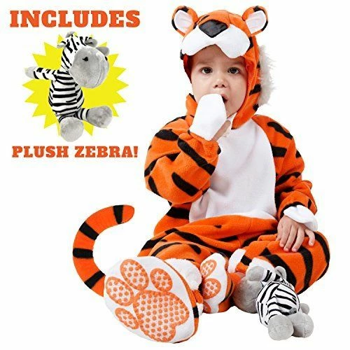 - Includes tiger hat, one piece tiger suit, tiger booties and toy zebra.