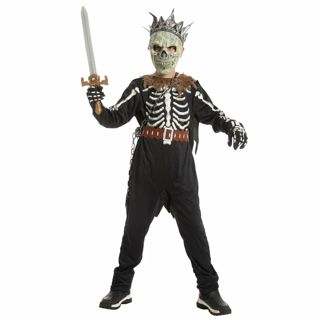 - Includes 1 long-sleeves shirt with skeleton print, 1 pair of pants, 1 cape with fur collar, 1 metal chain, 1 pair of skeleton gloves, 1 mask, and 1 crown.