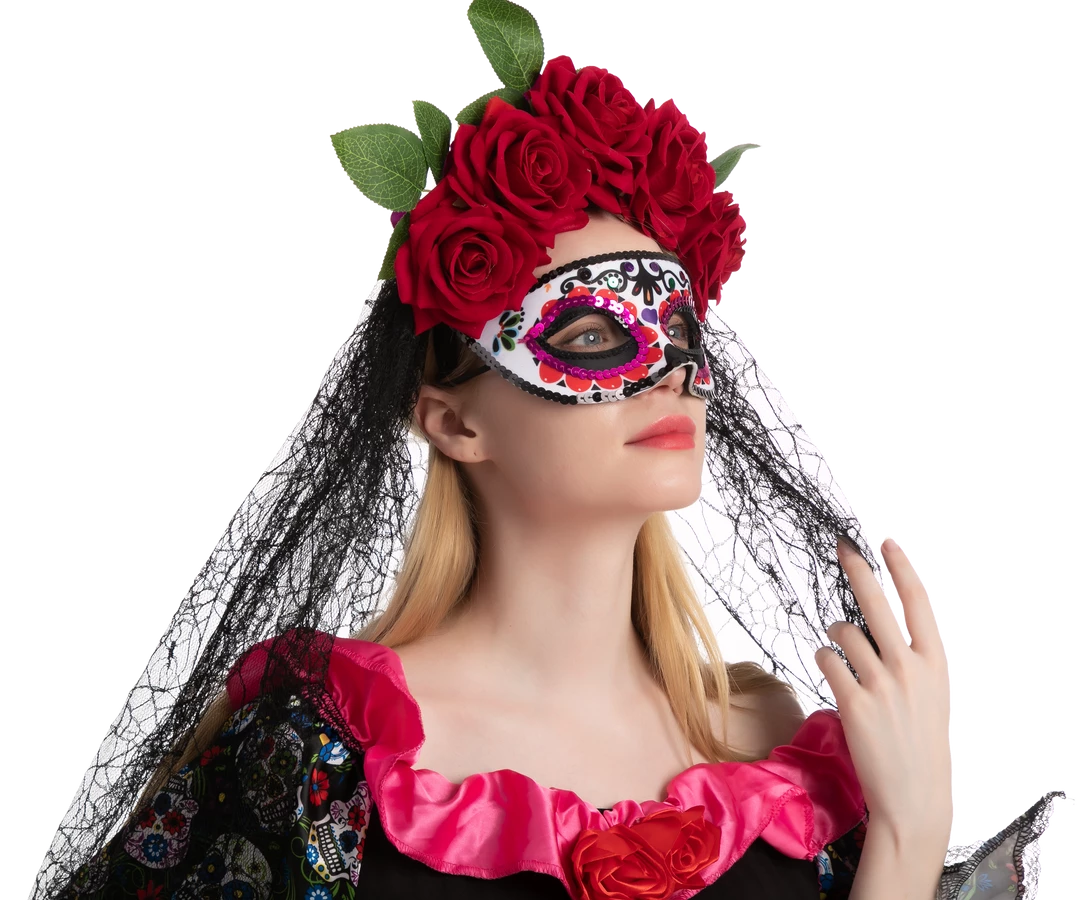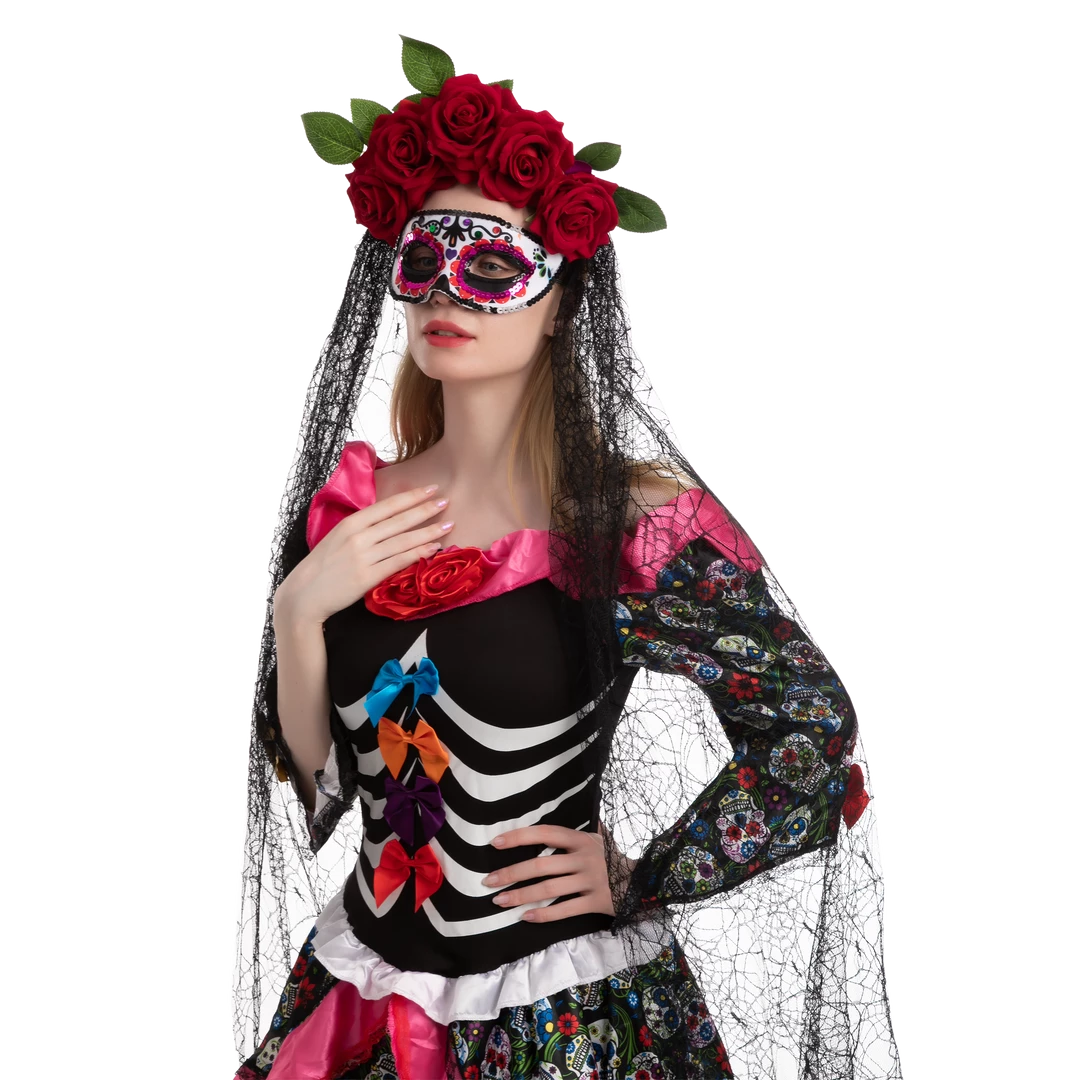 Spooktacular Creations Day Of The Dead Cosplay – Headband With Rose And Veil, Masquerade Eye Mask