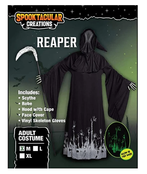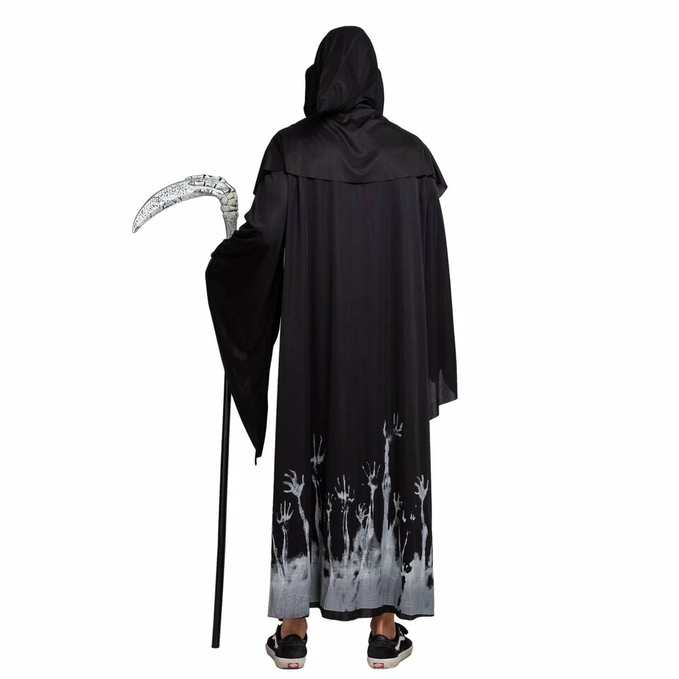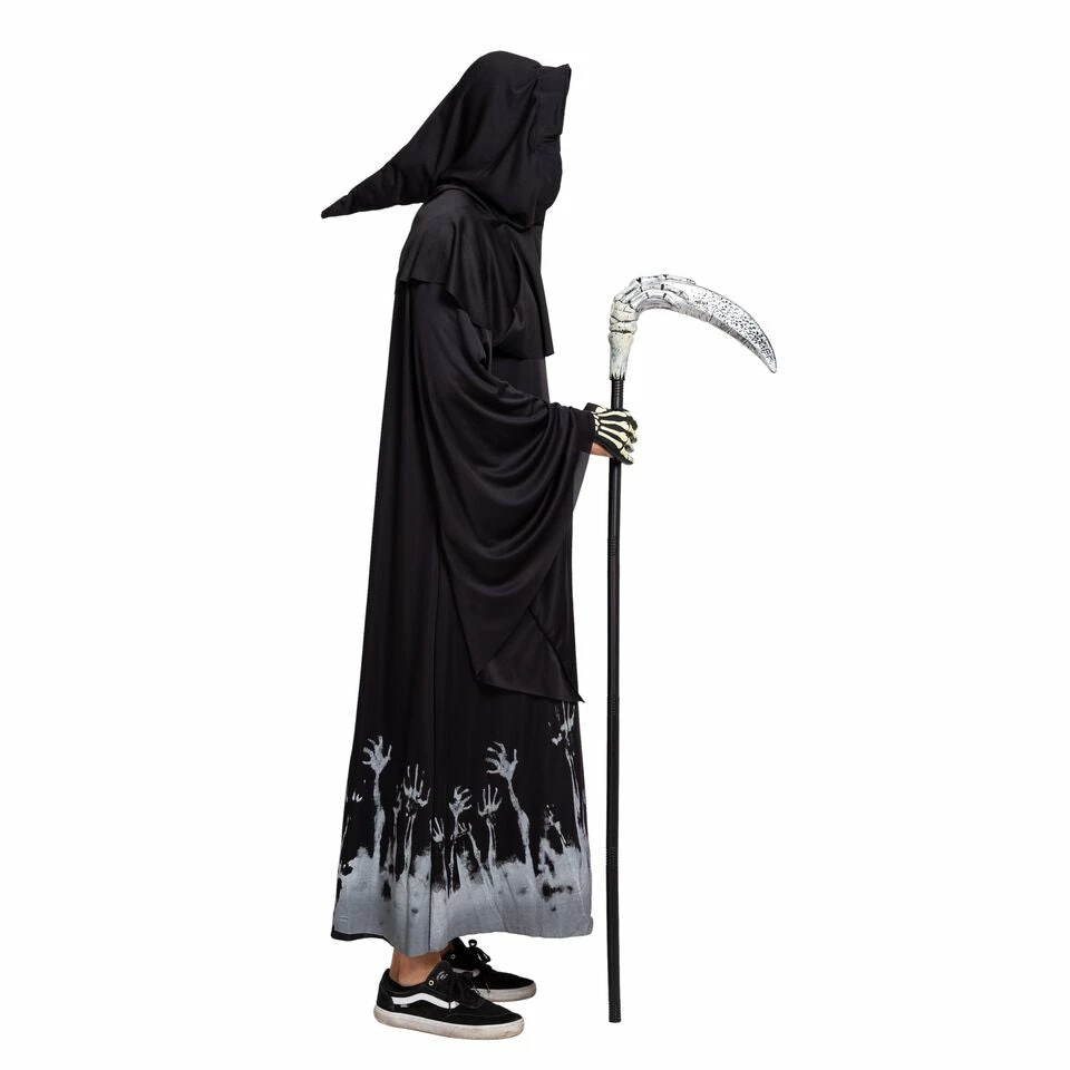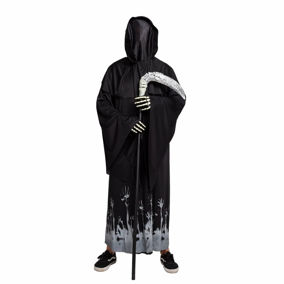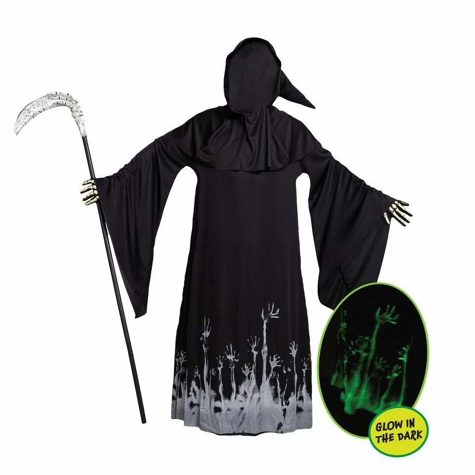 - Horror Demon Halloween Costume Includes Grim Reaper Scythe, Black Cloak Rope with Glow Pattern, Hood with Cape, Grim Reaper Mask Face Cover and Vinyl Skeleton Gloves.