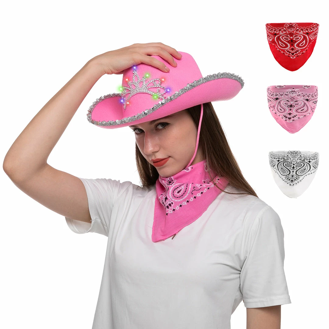 • Includes 1 pink cowboy hat with light up crown tiara, 1 red bandana, 1 pink bandana and 1 white bandana. 3 LR44, AG13 Alkaline Battery are needed for use.