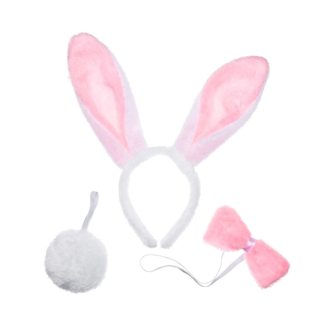 - White Bunny Ears and Tail Accessories Set includes fluffy bunny ears headband, bow tie, bunny tail, in a very cute and adorable style. Fits adult and kids.