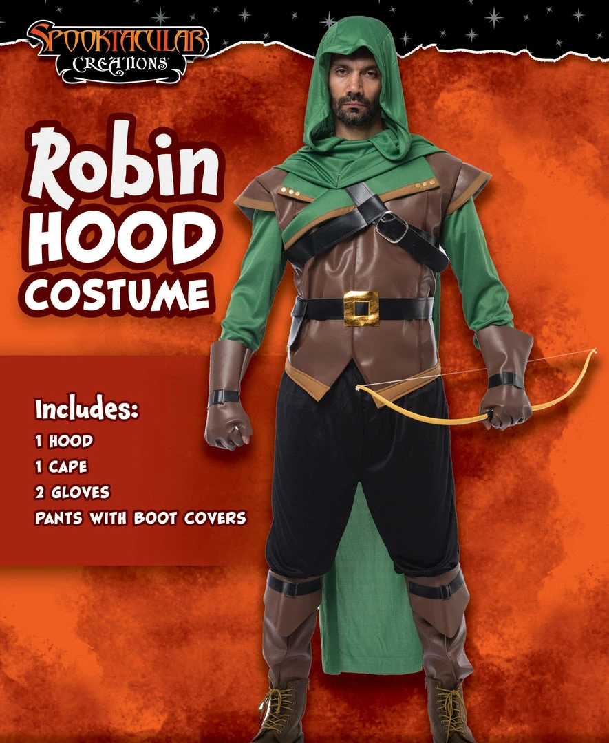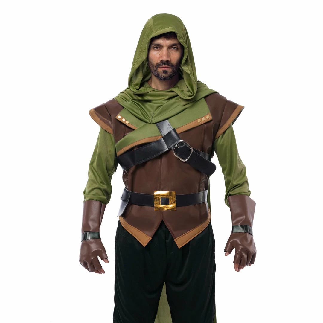 - Men’s Medieval Robin Hood of Nottingham Costume, includes Men’s Leather Tunic with Long-sleeve shirt, Hood, Vest, and Cape, 2 Gauntlet Gloves, Belt with Pouch, a Pair Pants with Boot Covers! (Arrows and Bow not included)