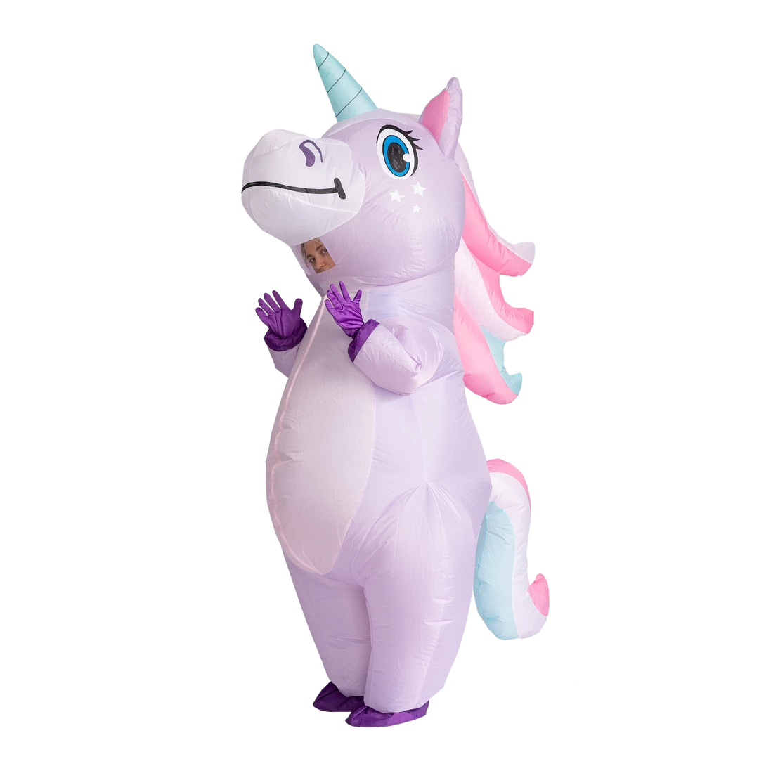 Spread some magic this Halloween in this adorable White Unicorn Full Body Inflatable Costume! Full of bright colors and sparkle, become the life of the party at any event. Comes in pink, blue, purple, or white.