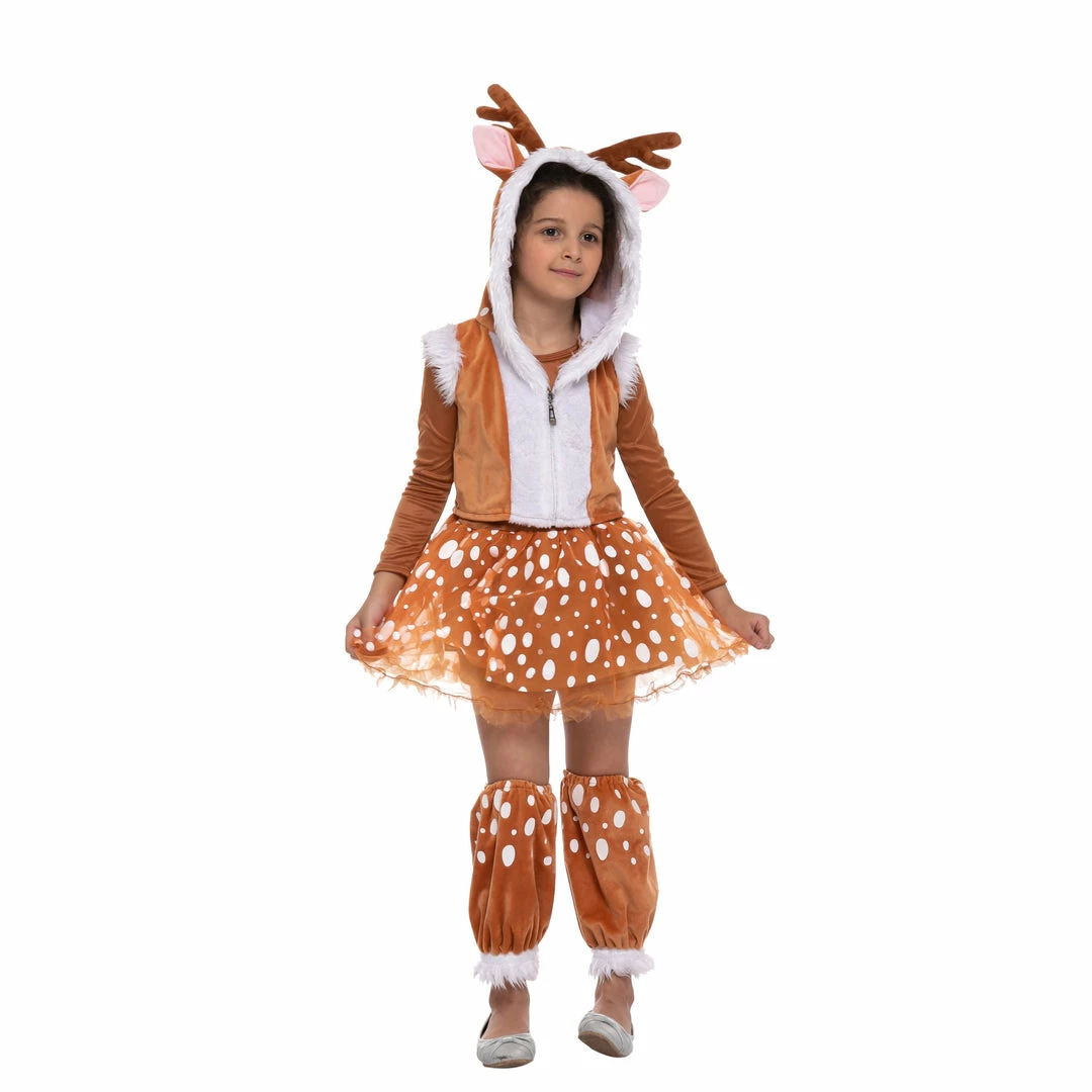 - Deer costume set includes 1 dress w/ hood, 1 vest, and 1 foot cover. Perfect Halloween outfit!
