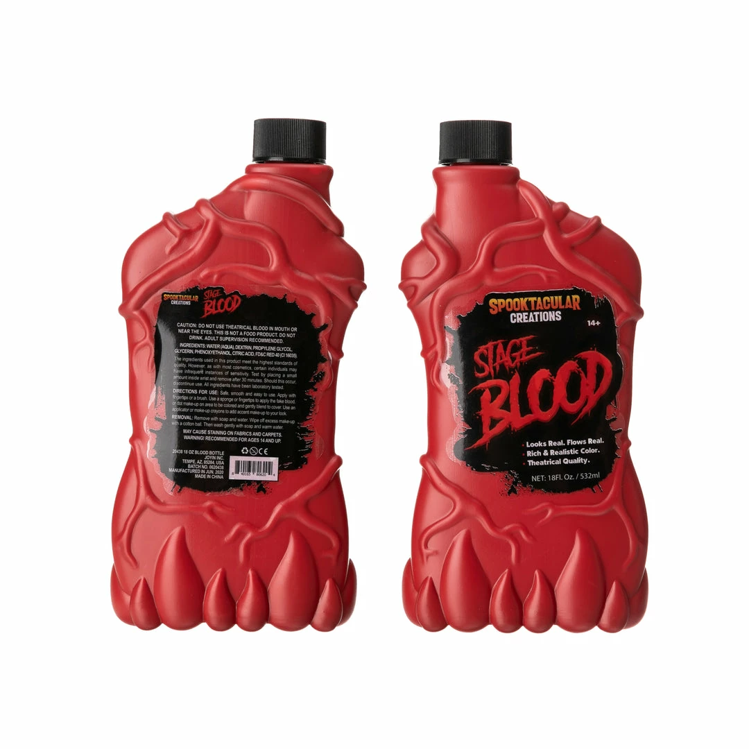 • Comprehensive Set. 18 oz Fake Blood Bottle. Our fake blood features an incredibly vibrant blood red color that looks and flows like the real thing. It is great for creating frightfully realistic special effects.