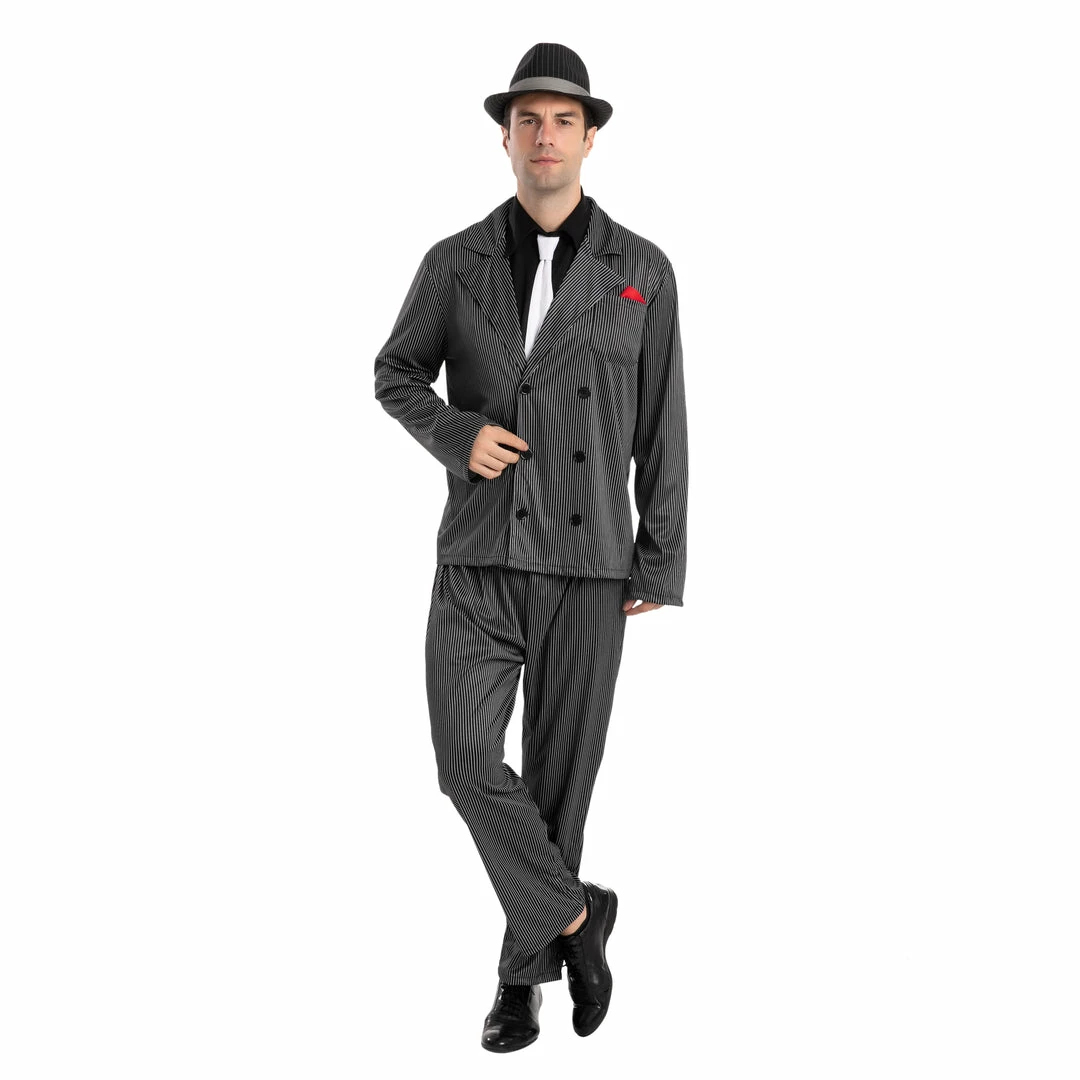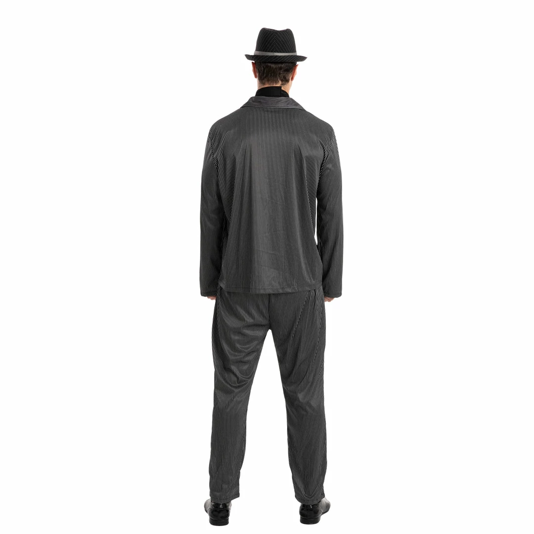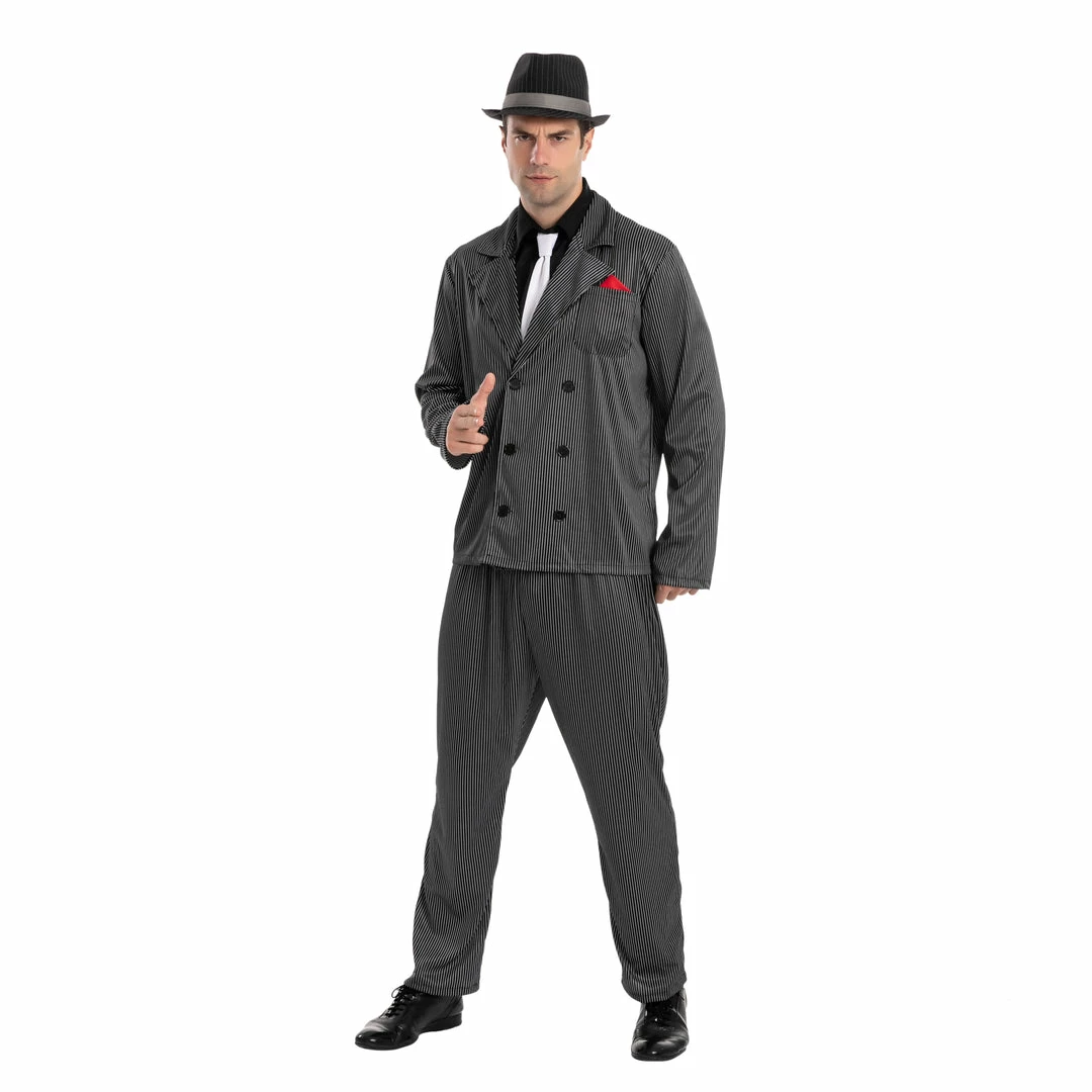 - Gangster Costume mafia pinstripe suit. Get ready to rule the underworld dressed in this excellent gangster outfit! This costume set will have you really looking great and attractive during your Halloween costume party! This is made super durable with superior quality. The material is made out of 100% polyester.