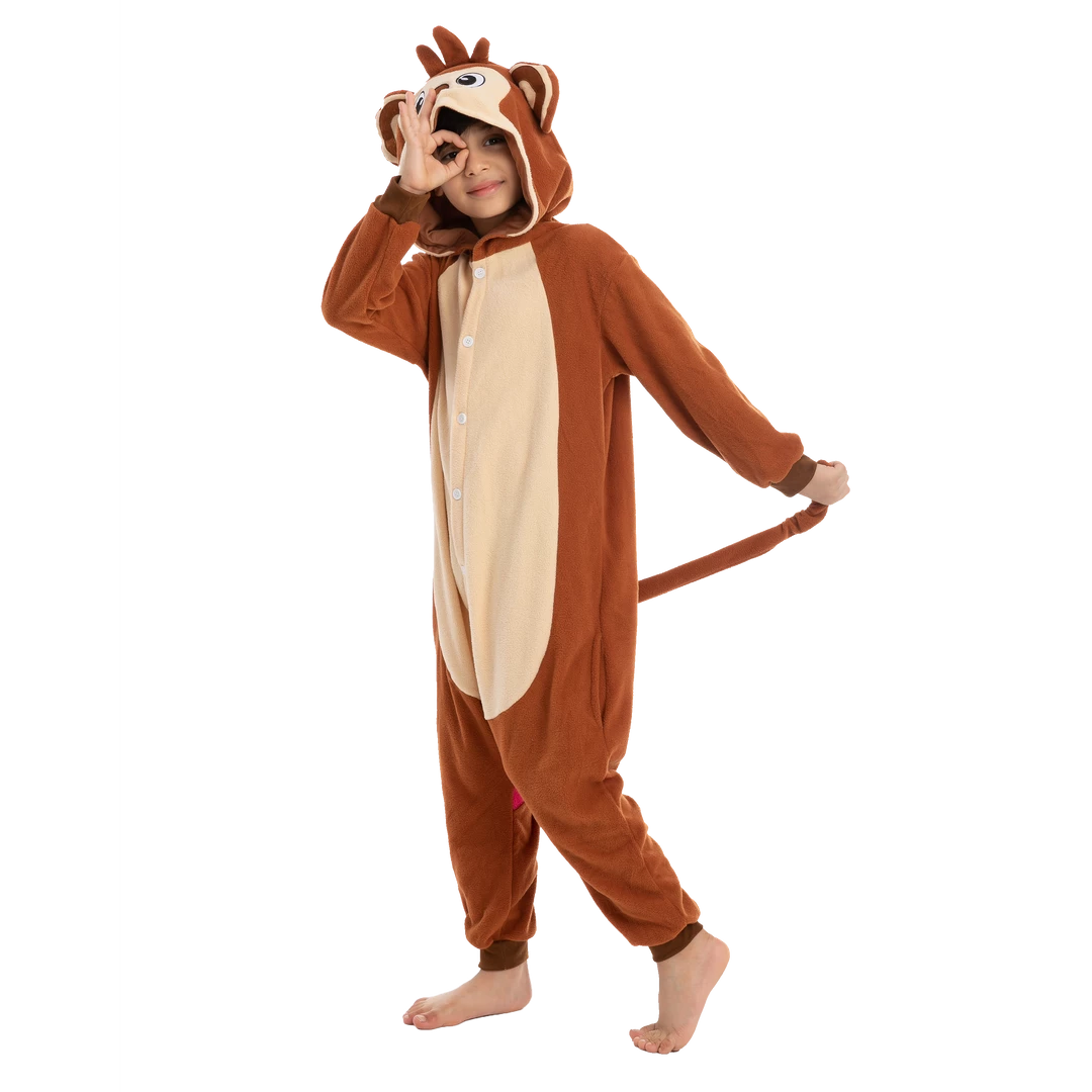 • Deluxe version of monkey pajamas one piece plush cosplay animal costume onesie. Child size. Made with high quality plush fleece materials.