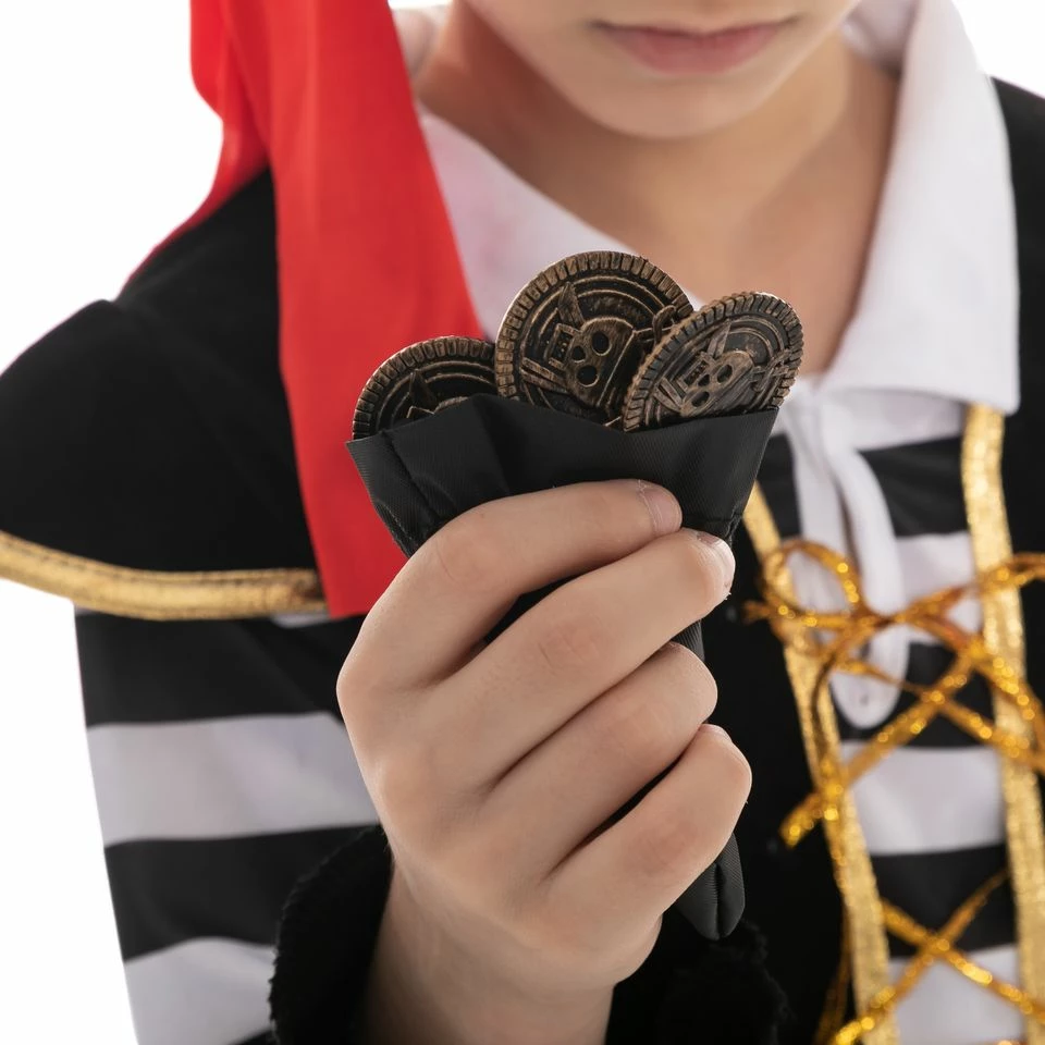- Our Captain Pirate Costume comes with a vest, belt. Pirate hat, pants, a pair of shoes, compass, pirate sword, earring, and 1 coin bag with 6 coins. Everything is included for your little pirate’s costume!