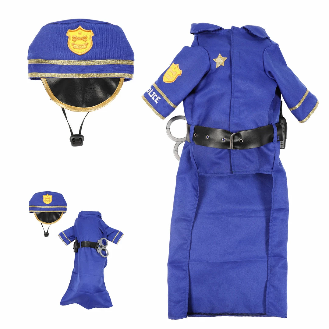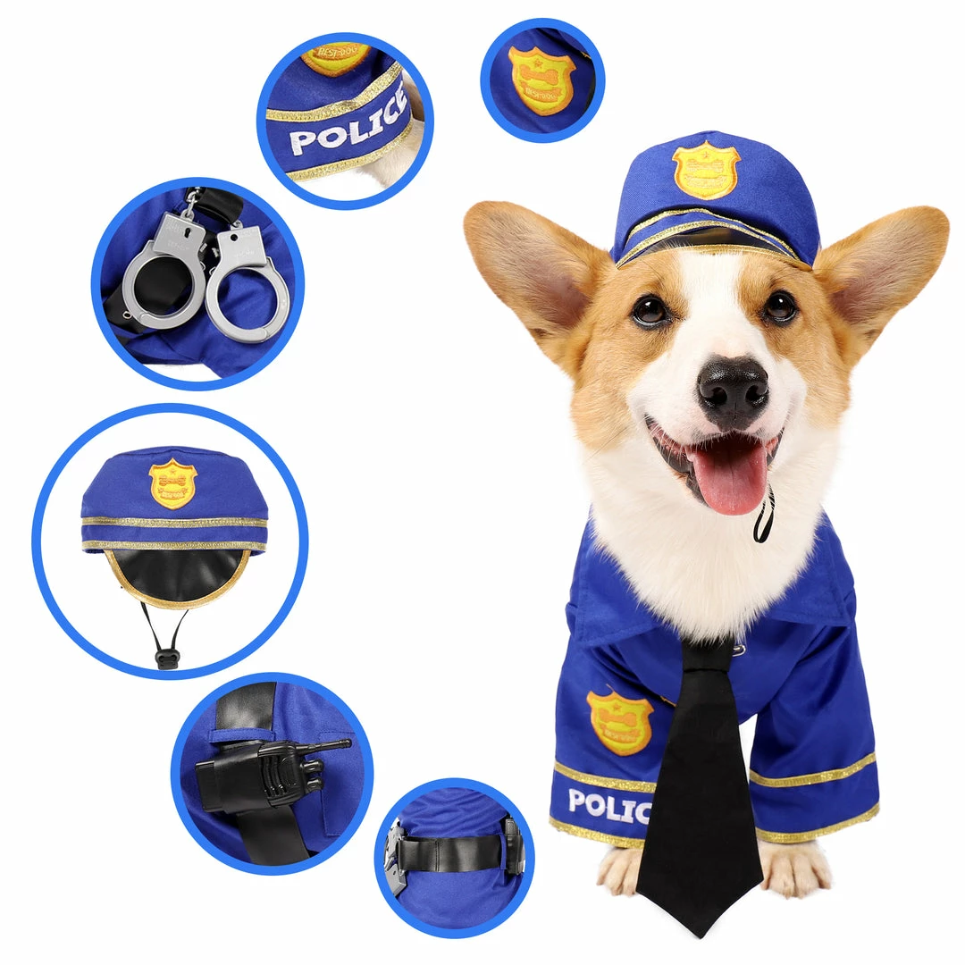 - SUPER VALUE PACK. Super value of Halloween Role Play Party Costume. Costume features a blue shirt decorated to look like a police uniform. Police Officer pet costumes come with the police shirt with velcro closure, hat, tie, belt with attached accessories including handcuffs, walkie talkie.