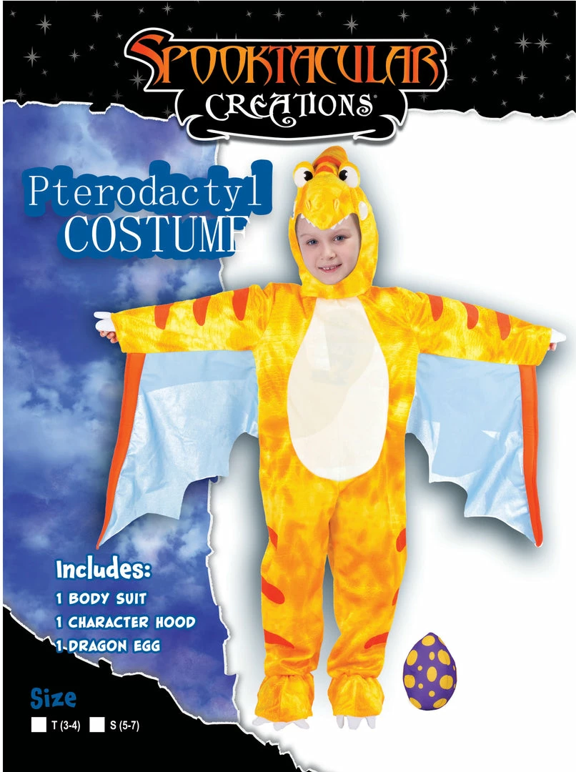 - Spooktacular Creations Includes dinosaur character hood, jumpsuit with attached wings, tail and shoe covers, and 1 plush egg.