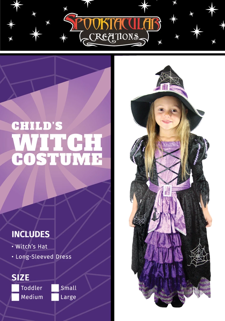 - Includes witch’s matching hat and full-skirted long-sleeve dress. Broom not included.