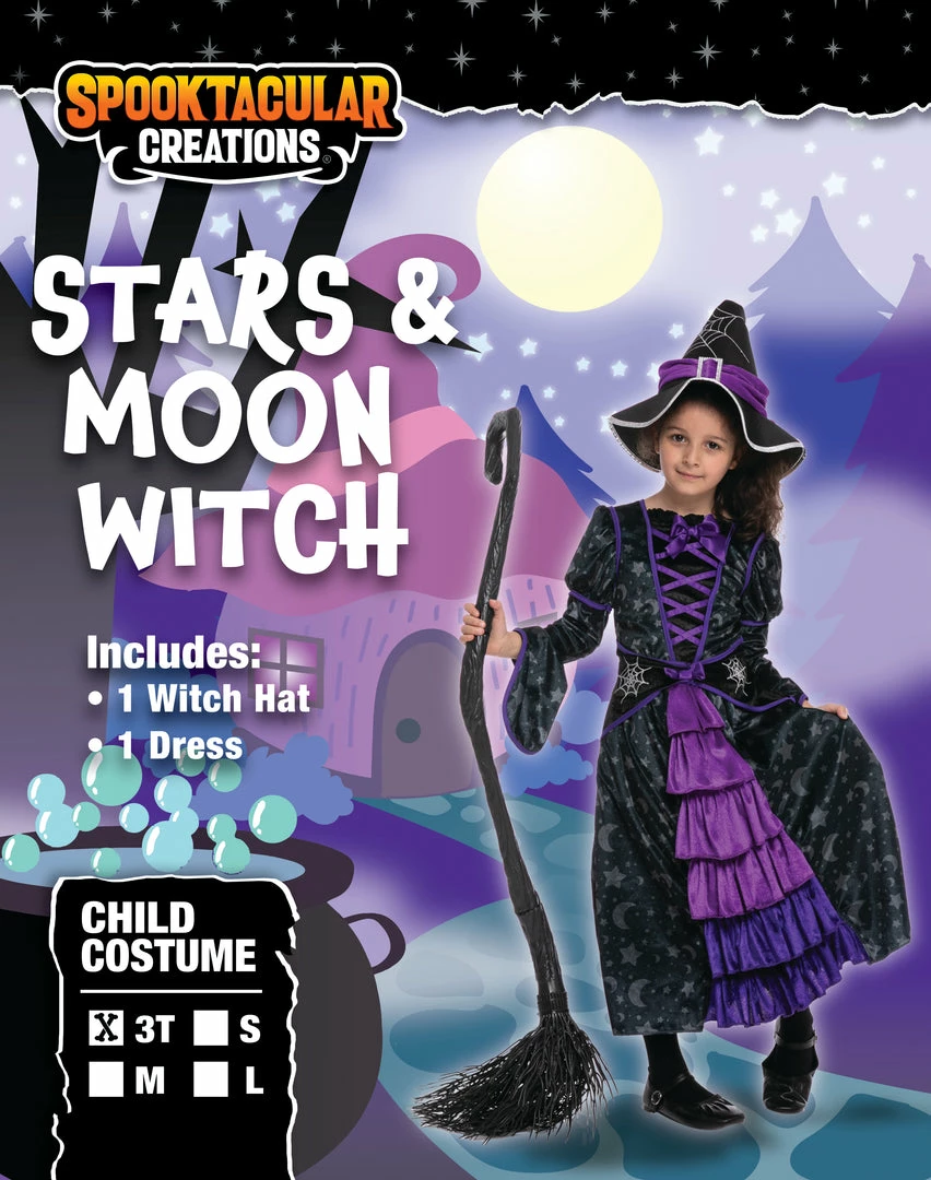 • Includes Witch’s Matching Hat and a Long Purple and Black Dress with Stars and Moon Pattern.
