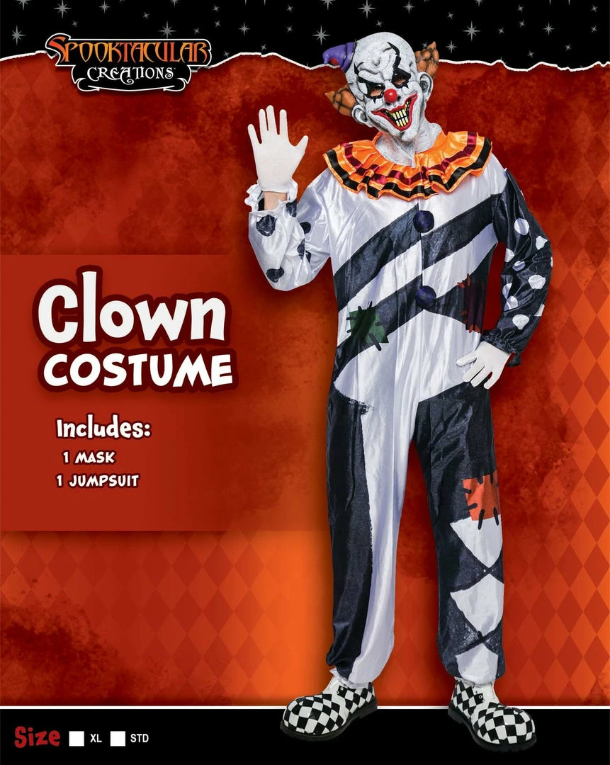 - Men’s Creepy Clown Costume Deluxe Set. Realistic Looking, Super Durable. Superior Quality. 100% Polyester for Fabric and Vinyl for Mask. Highly Recommend Hand Wash. Meet US Toy Standard. Safety Test Approved.