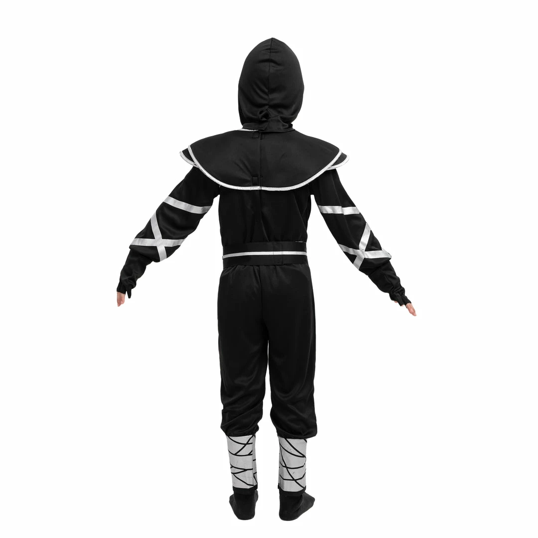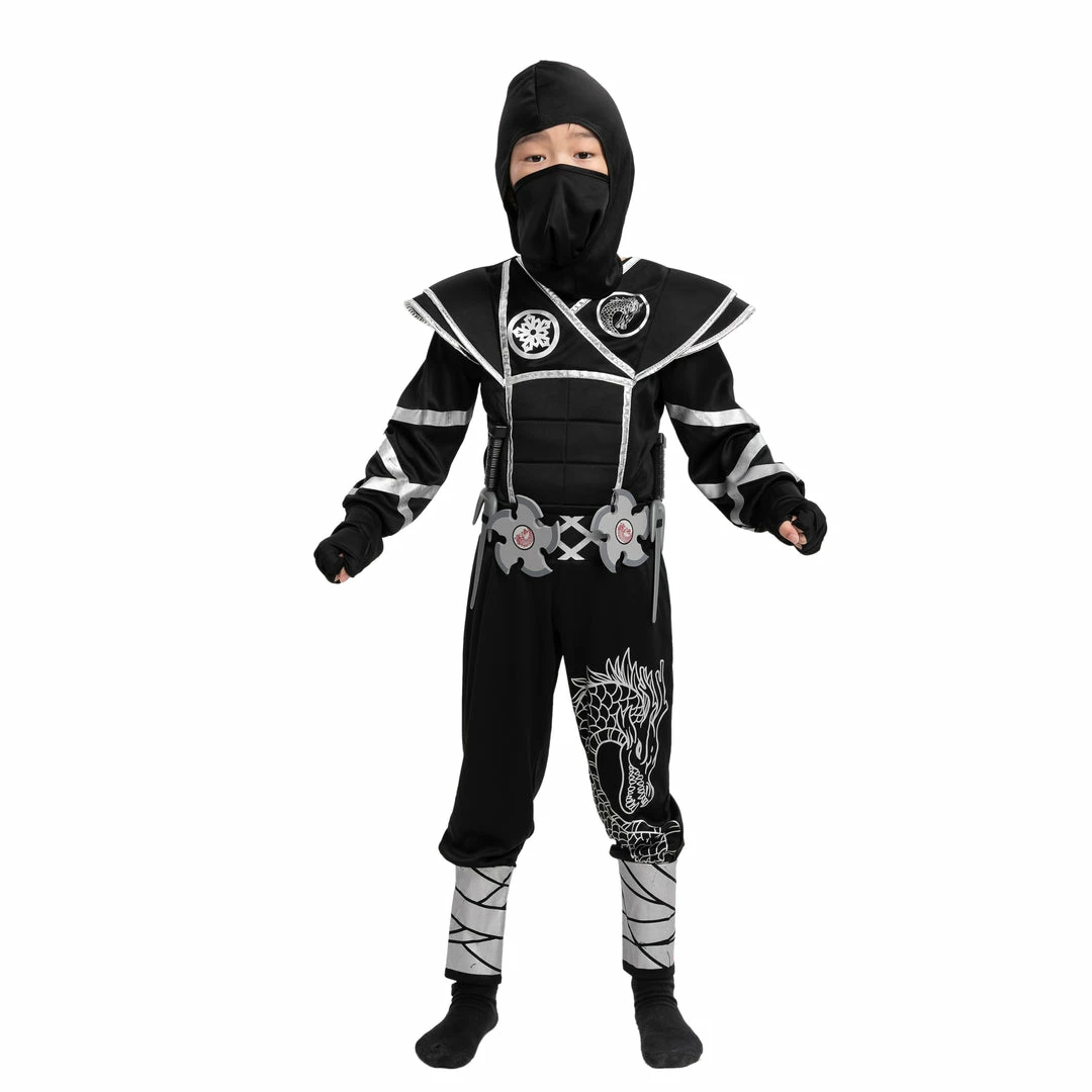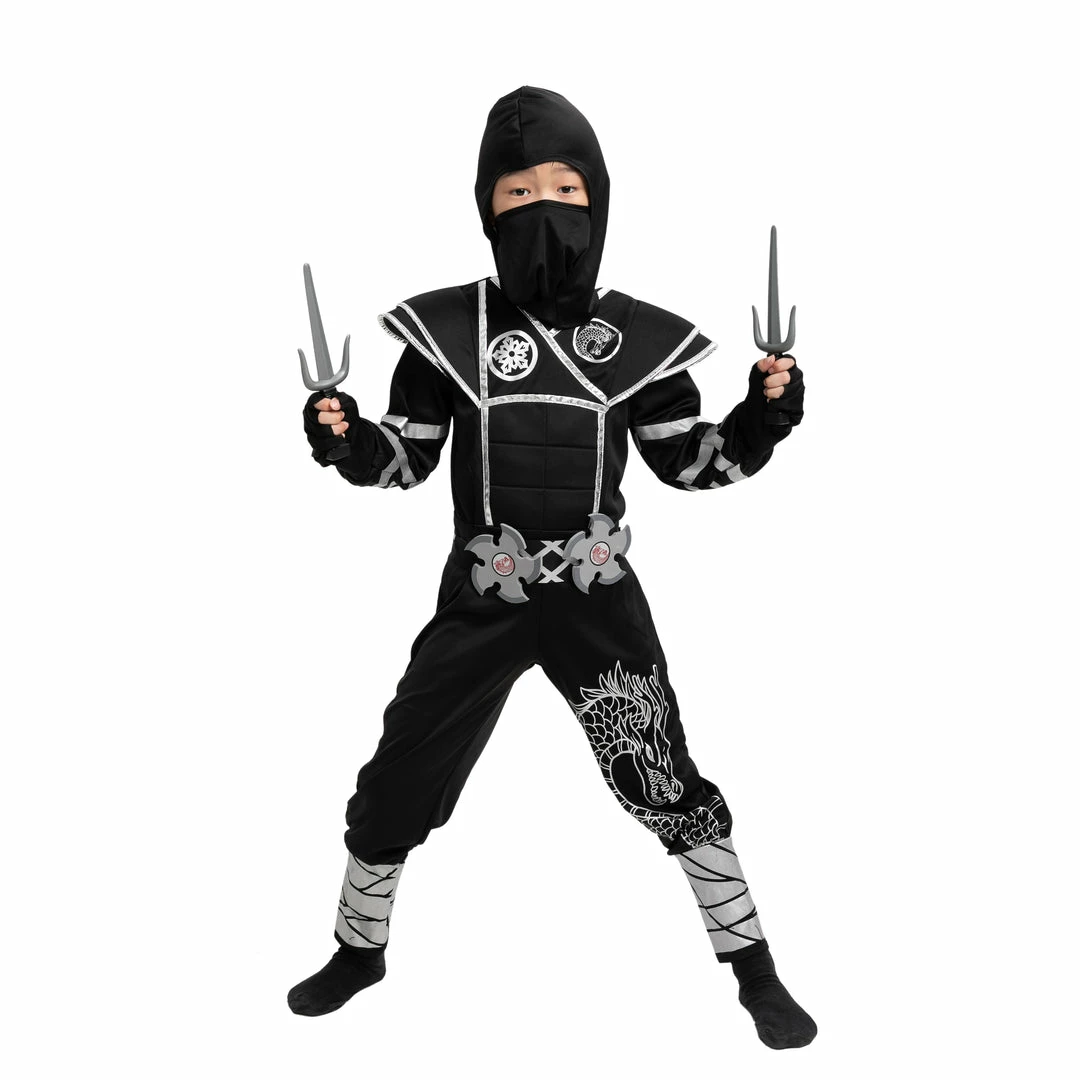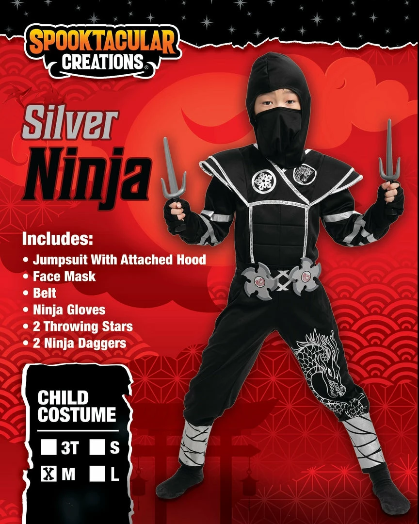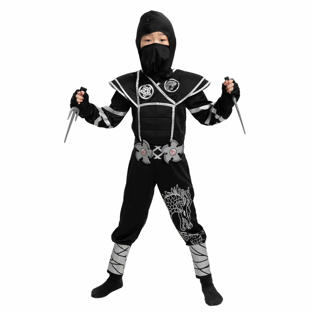 - 8 Pieces Total Halloween Silver Ninja Dragon Costume for Boys and Girls Includes Ninja silver Jumpsuit with Attached Hood, face mask, belt, ninja gloves, 4 Pcs Ninja Accessories