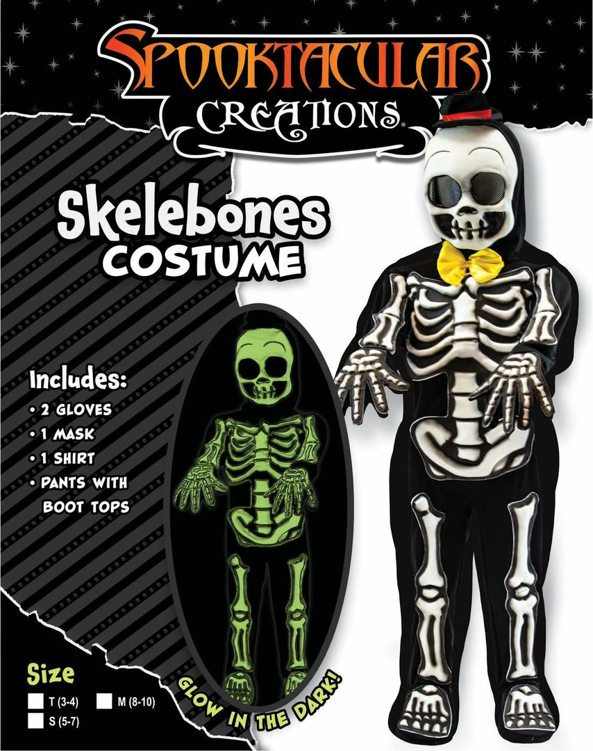 - Unisex Skull Kids Skeleton Costume from Spooktacular Creations includes black skeleton shirt and a mask with EVA bones, 2 gloves, and pants with boot tops.