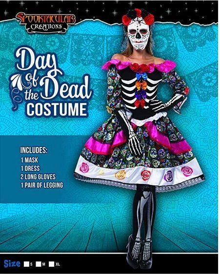 - Day of Dead Senorita Costume for Women includes Spanish Sugar Skull Print Dress w/ Lace-Trimmed Off-Shoulder Pink Neckline, Corset Waist and Layered Ruffled Skirt w/ Tulle Hem, Gothic Long Black Veil on Headband containing 2 Black and 3 Red Roses, Mask, Skeleton Long Gloves, 1 Pair of Skull Legging