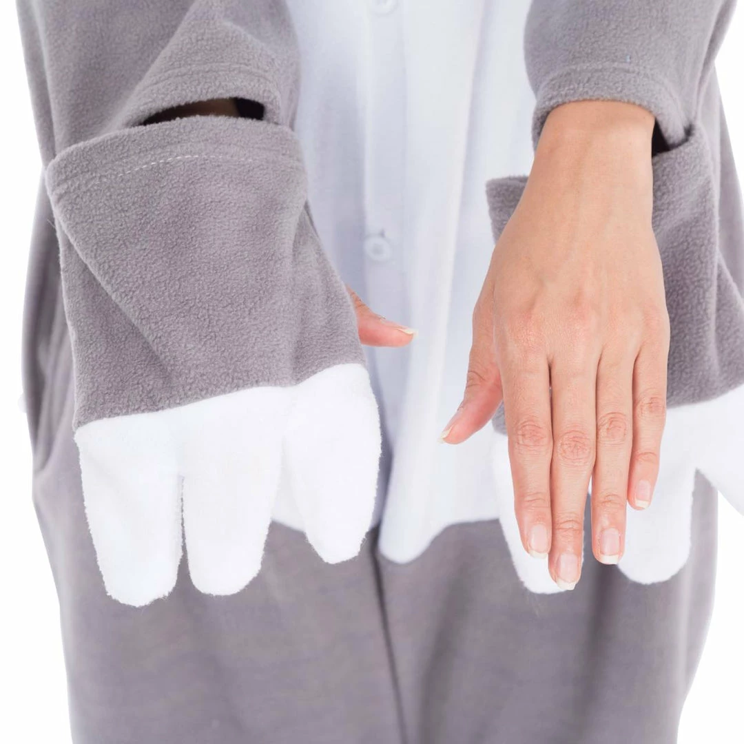 - Plush Fleece Materials Keep You Warm and Soft Touch. The Button Up Closure Allows Quickly Get Dressed or Remove the Costume. Built-in Pockets Allows Stashing Your Phone, Wallet or Other Items.