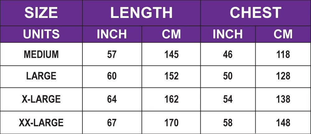 - The Small Size Measures 46 Inches in Chest, 53 Inches in Length, Medium Size Measures 49 Inches in Chest, 57 Inches in Length, Large Size Measures 51 Inches in Chest, 61 Inches in Length, Extra-Large Size Measures 54 Inches in Chest, 65 Inches in Length. Fits Good for Most People.