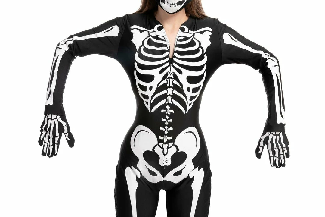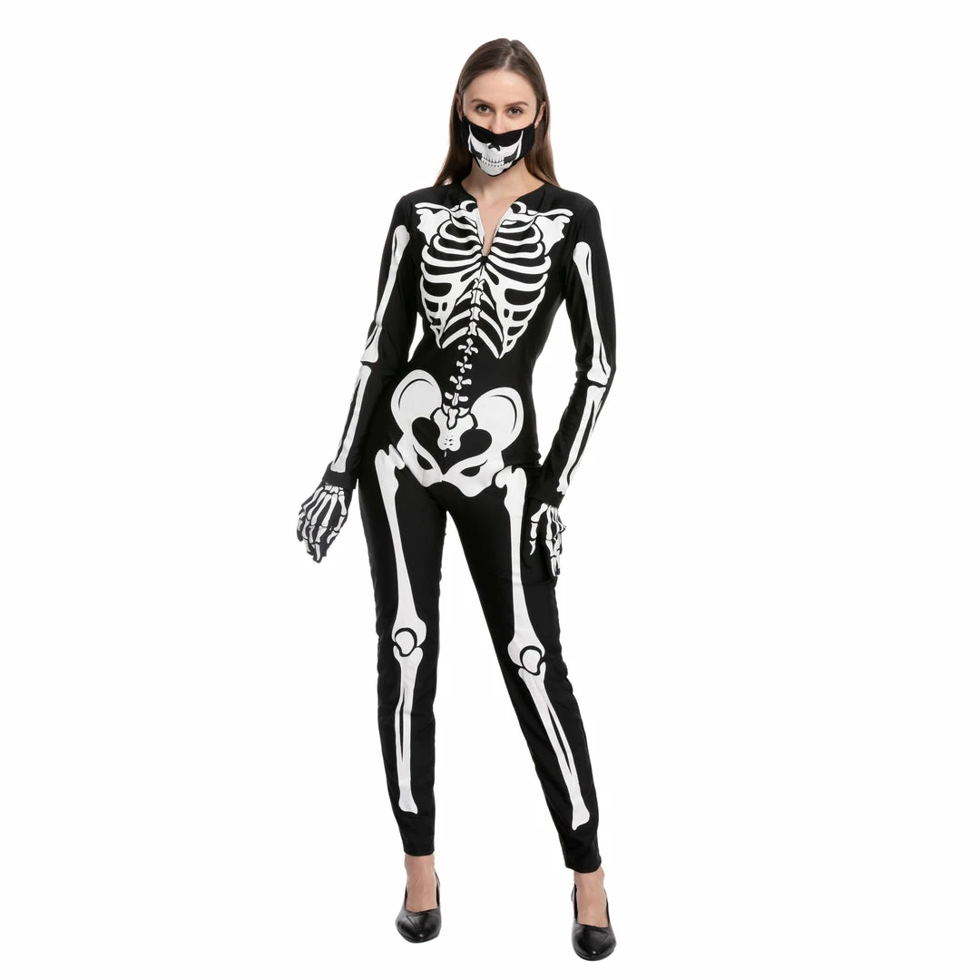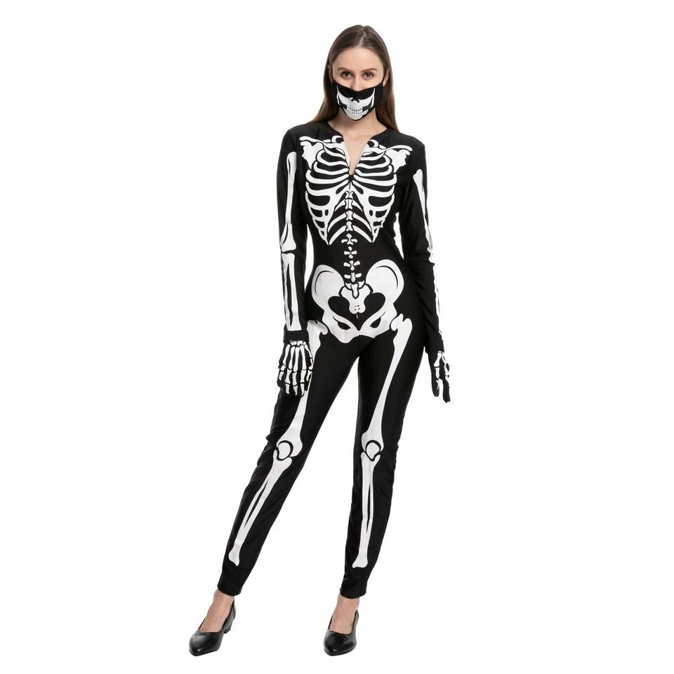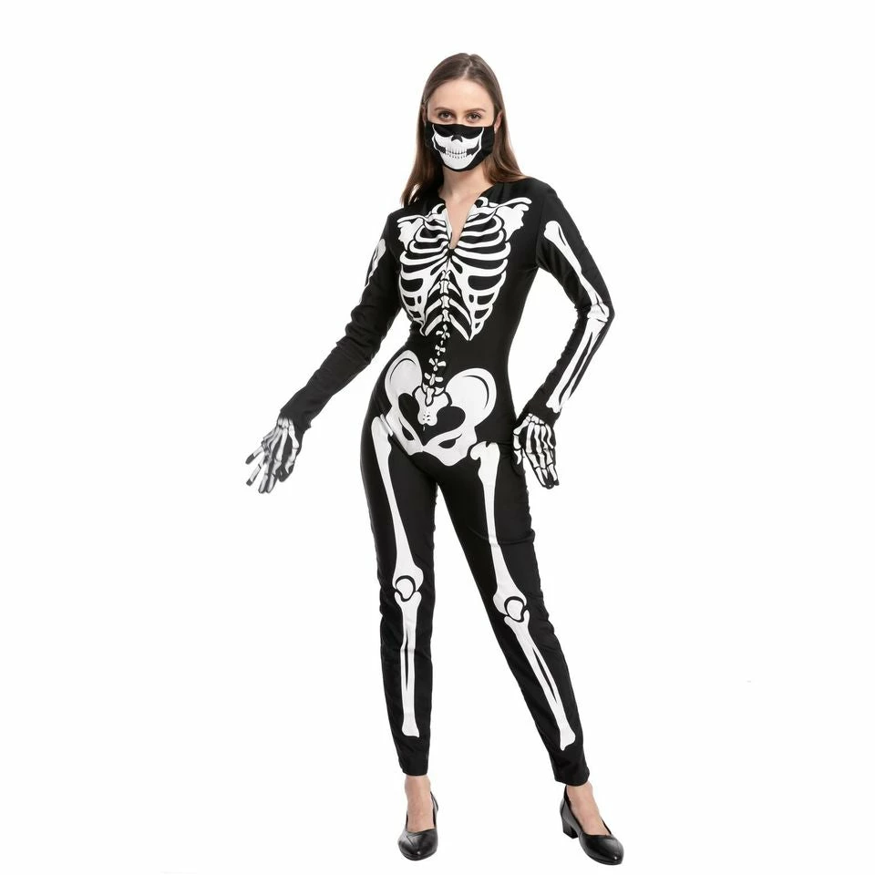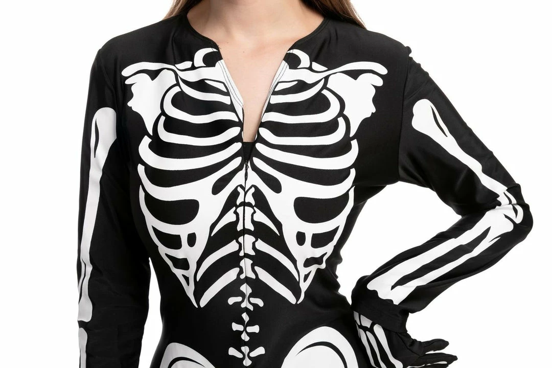 - Includes 1 skeleton printed adult v-neck bodysuit with mask.